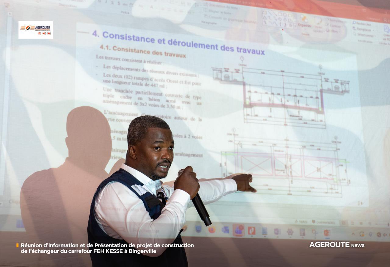 La séance a été conduite par M. Teny ARNAUD, Chef du Service des Grands Ouvrages, représentant l’AGEROUTE, avec à ses côtés le Chef de Projet, M. Nicaise DOMOA. Les responsables du projet ont présenté les objectifs, les composantes techniques ainsi que le déroulement des travaux, tout en mettant un accent particulier sur l’organisation du chantier et le maintien de la circulation.