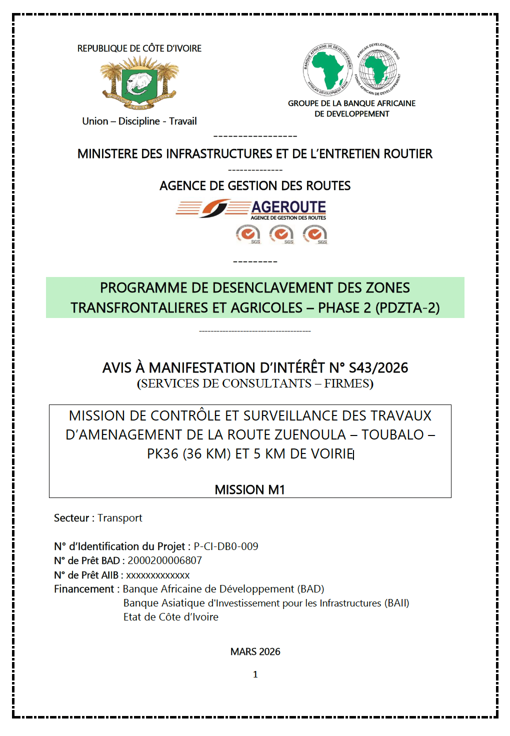 MISSION DE CONTRÔLE ET SURVEILLANCE DES TRAVAUX D’AMENAGEMENT DE LA ROUTE ZUENOULA – TOUBALO – PK36 (36 KM) ET 5 KM DE VOIRIE